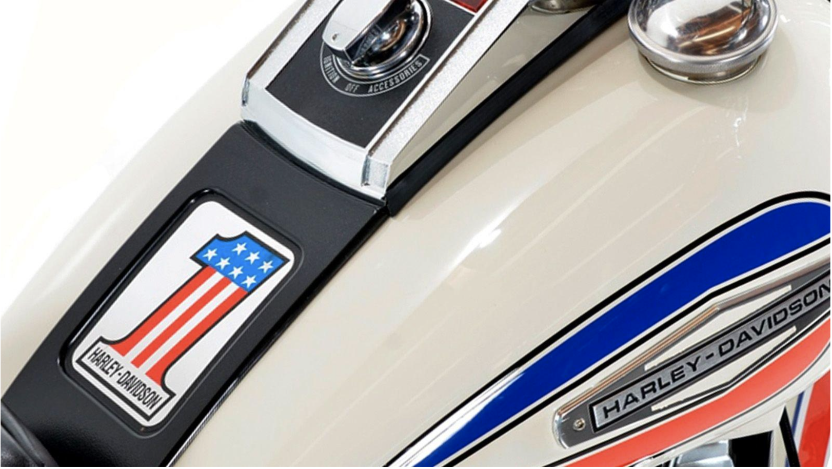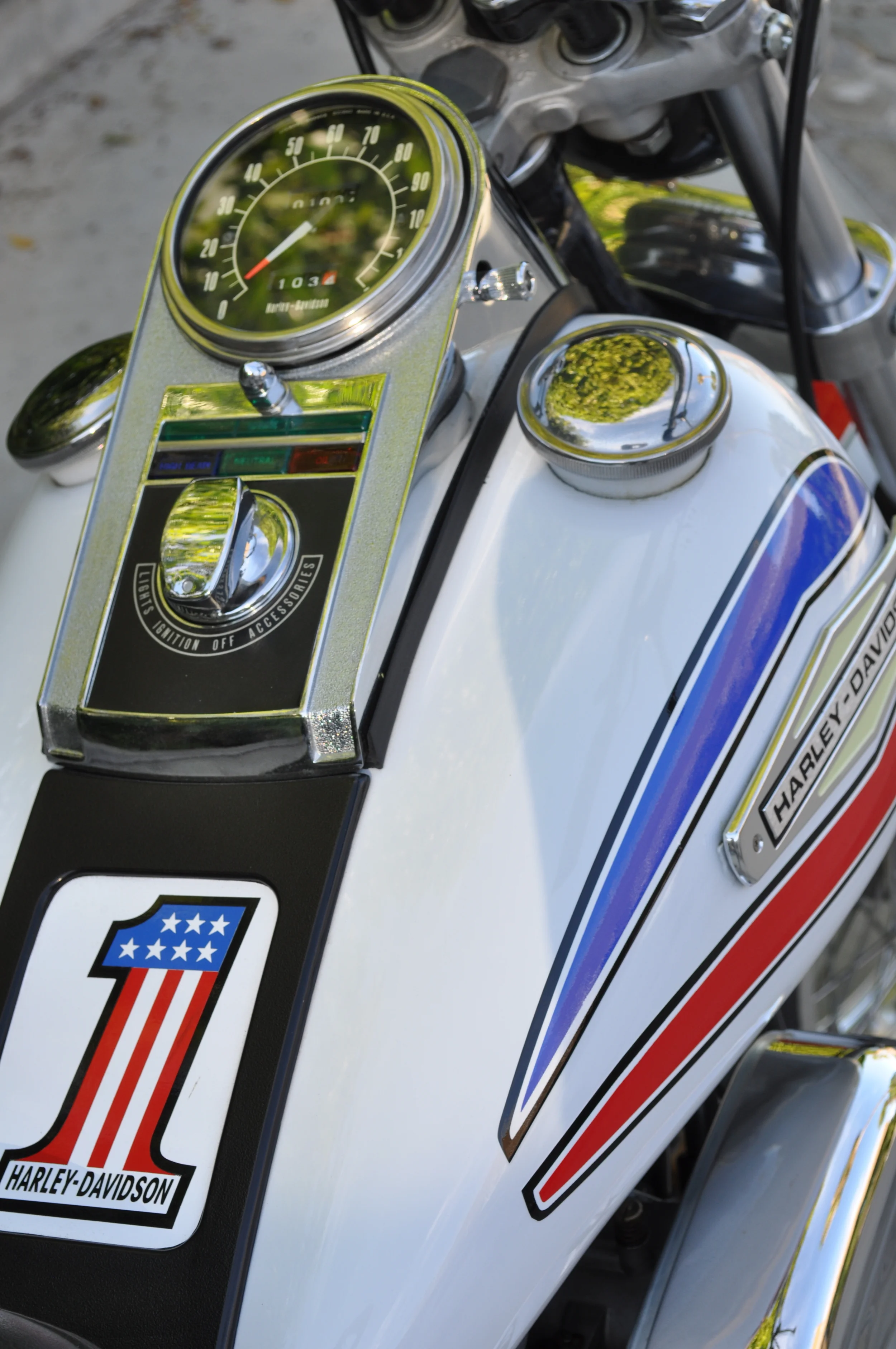 The next step was deciding on a paint scheme as well as how to market the machine. The United States was in the midst of the war in Vietnam and all the divisiveness associated with it. He wanted to please their traditional hawkish customers as well as young people who were against the war. The board of Harley-Davidson knew that the custom/chopper image that the FX model was designed around could evoke many potential negative emotions due to its association with both the 1% biker clubs as well as with pot smoking hippies like the characters on the recently released Easy Rider movie. It would’ve been interesting to be a fly on the wall of those marketing and board meetings. Nevertheless, the end result was the famous sparkling America paint job, white base with red and blue prominent striping. They also used the famous number one Harley logo design featuring a large number one in red white and blue with the name Harley-Davidson as the bottom. This had been designed earlier in 1970 by an unnamed Harley-Davidson employee after their recent Grand National racing victory led by Mert Lawill. They put this logo framed in a cover on top of the split gas tanks in front of the seat. The red white and blue American flag paint scheme and the American flag number one logo satisfied the America – love it or leave it crowd. This group also thought the red white and blue Evil Knievel paint schemes may have been a template. The factory custom chopper-like styling as well as the possible linkage to the red white and blue featured on the Captain America chopper in the Easy Rider movie satisfied the antiwar group. Even though the Super Glide came in multiple colors, the bike was widely marketed in magazine ads mainly in the Sparkling America paint version. In addition to the ad copy that I described earlier the prominent use of the description “All American Freedom Machine!” was used.