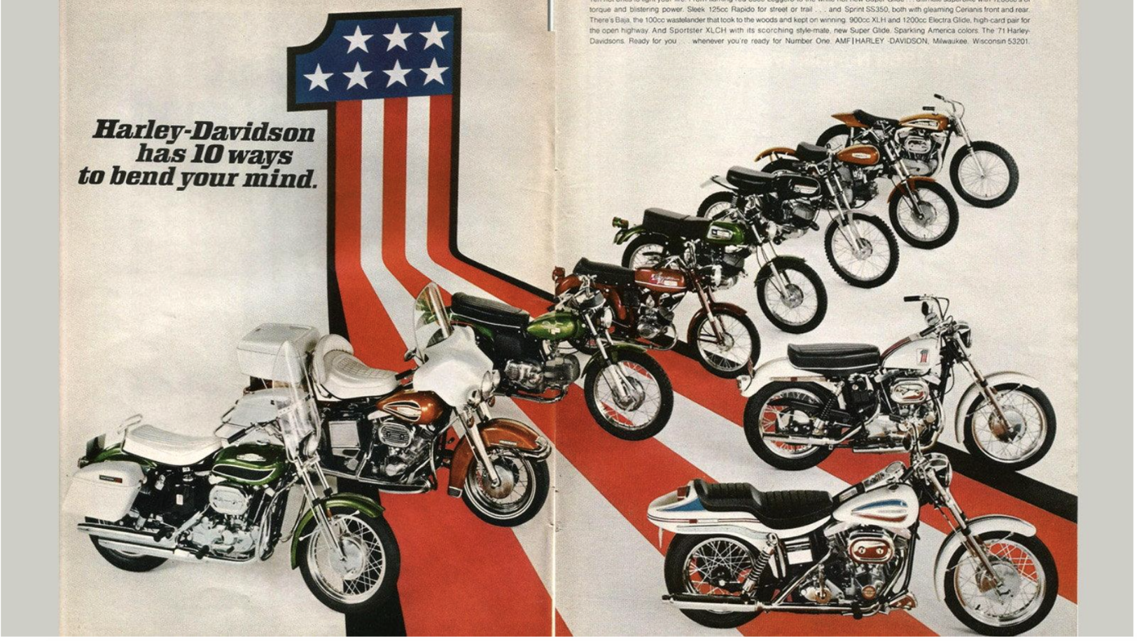 In 1960 Harley purchased controlling interest in Aermacchi to take advantage of their light weight motorcycle line. This was done to compete with the burgeoning demand for entry-level and lightweight motorcycles. Through the 1960s the Aermacchi lightweights the Harley lineup but could not effectively compete with the onslaught from Honda, Yamaha, Kawasaki, and Suzuki motorcycles in terms of cost and quality. In addition, the Japanese makers seem to have better advertising firms especially with the example of the Honda ads that proclaimed “you meet the nicest people on a Honda”. Harley was still having to fight the image of its association with the hooligan biker groups made infamous at Hollister in 1947 and the movie “The Wild One” in 1953. Much like the Beatles, whose light shone so brightly in the early and mid-1960s, and then flamed out by 1969, Harley followed suit. In the early 1960s, Harley and motorcycles were practically synonymous in the United States. They were winning road racing championships and flat track dirt bike championships, dominating at every level. However, Cal Rayborn’s victory at the Daytona 200 on a specially prepared KR model, would be Harley-Davidson’s last street bike victory. The company had become bloated and top-heavy and to prevent a corporate takeover Harley Davidson was sold to another “leisure product” company called AMF Corporation.
