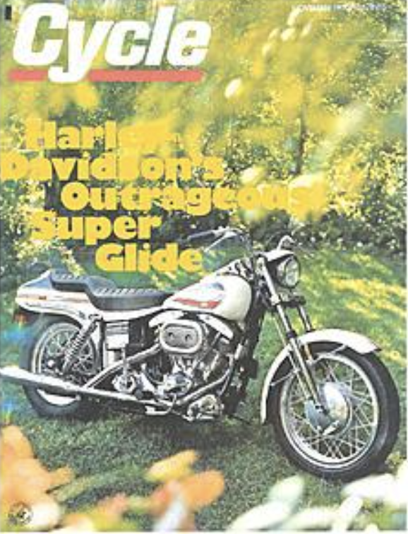 Summarizing the Super Glide: “the Super Glide faces you brazenly: it is what it is – massive bolts attaching massive appurtenances to a massive frame and a seat configuration that stretches over the horizon, the whole issue propelled along by an enthusiastic engine neither having nor wanting any excuses. It is terribly self-conscious, terribly extreme; it leaves itself no outs, brooks no compromises. It starts easily, runs well, doesn’t leak oil, will not break, and handles more than adequately. Visually, like it or not, the Super Glide is a dazzler, and Harley-Davidson’s commitment is a dazzling commitment. With the exception of the sickening failure of the brakes, the Super Glide is everything mechanically that it promises visually to be; and it will succeed in this country like no machine Harley Davidson has ever made or dreamed of making.”