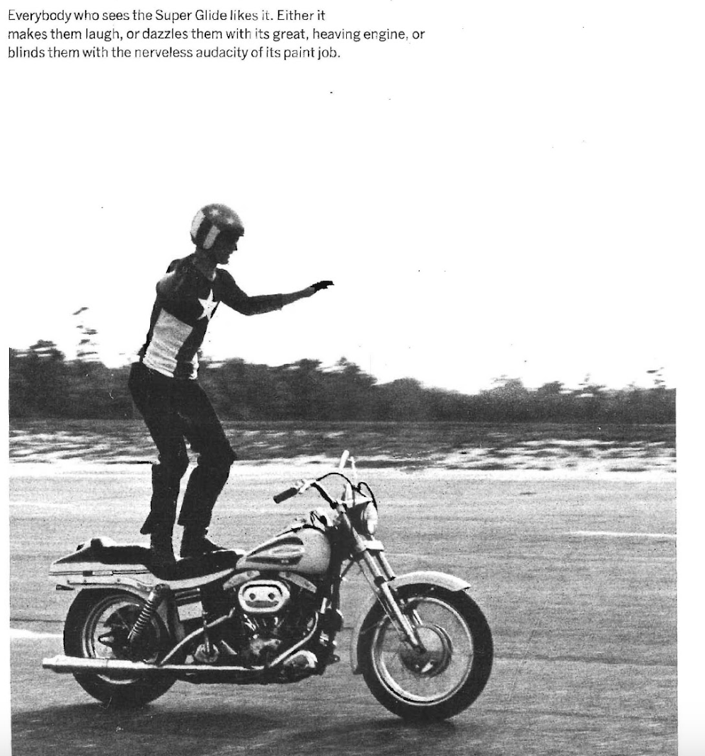 Regarding how the Super Glide makes you feel: “what does the bike do for you? How do you feel when you ride it? You feel like a damn King is how you feel; everybody is looking at you, admiring the waves of bravado that flood off the exterior of the Super Glide, digging the bongo beat rhythm of the engine. The Super Glide is turned out for a parade; subtlety never makes it in a parade, And Subtlety Dares Not Exist on the Super Glide.”
