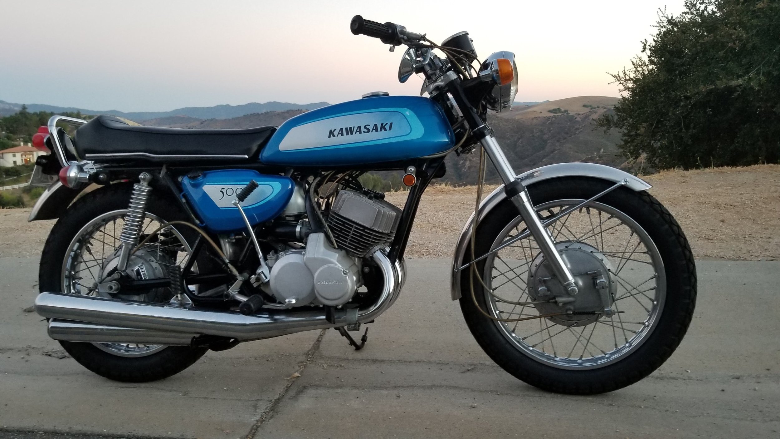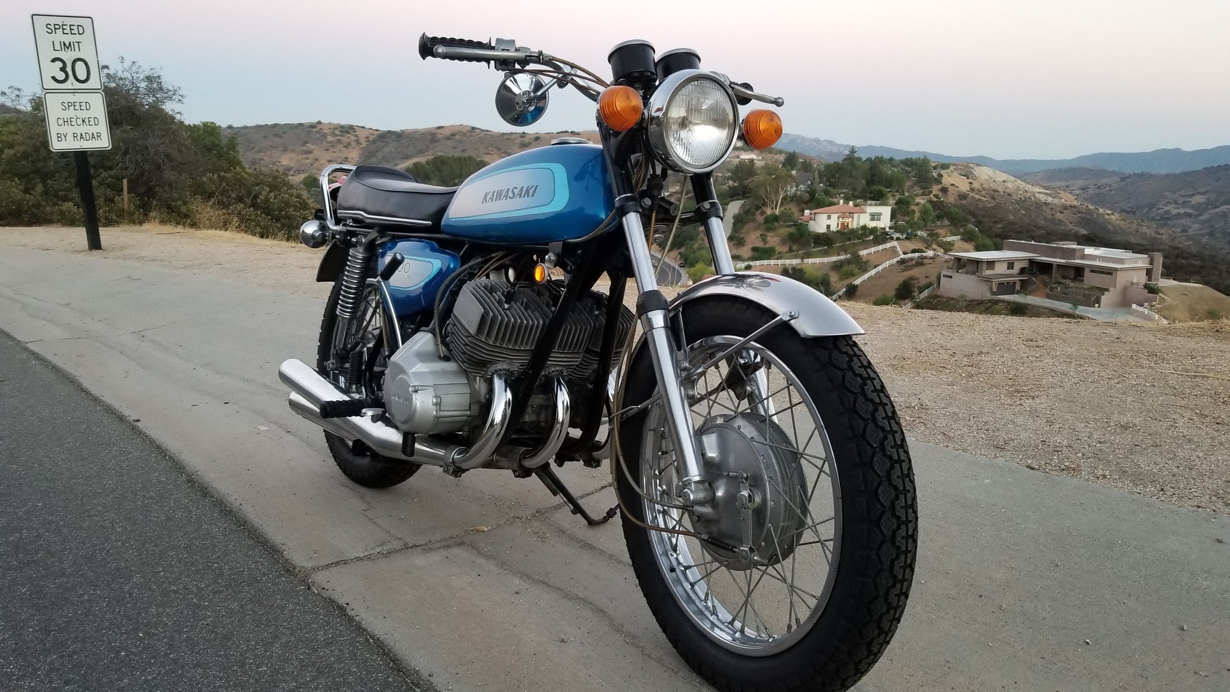 Years later, it was hard to find the particular 1971 Candy Blue Kawasaki Mach 3 500 that I wanted- an unmolested factory original in near showroom condition. They had all been thrashed and wrecked and abused. Eventually, I located the right bike. It was a completely original machine down to the air in its original factory tires! This motorcycle had just barely 5000 miles on it had been stored in an insulated and weatherproofed garage for 30+ years by its original owner. It had virtually no corrosion or the usual “patina” associated with being put away wet and uncared for. The original factory paint and polished steel fenders still gleamed brightly. There were no dings or dents or any damage. Most importantly, it had been started and run regularly and was mechanically perfect.
