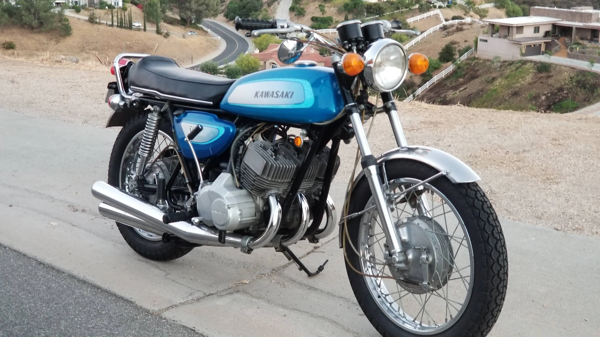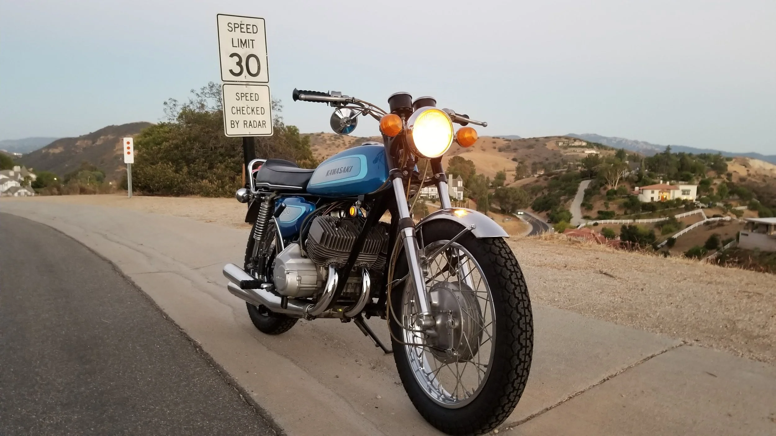 Fast-forward a little over two years to the early fall of 1971. Now I actually had my driver’s license and had also passed my motorcycle test and had my motorcycle driver’s endorsement. In 1971, Kawasaki had put out the third in the initial series of 500 cc two-stroke monsters. Largely unchanged, they had slightly redesigned the gas tank to make it a little more sleek and modern in appearance. Instead of simple classic white, it now sported a new color called Candy Blue. I had shoveled snow in the winter time and mowed lawns in the summer and had saved every dollar I could. Going home one day I noticed a flash of blue in my peripheral vision and to my delight there was a 1971 Kawasaki Mach 3 500 In Candy Blue sitting in front of the local hardware store with a for sale sign on it. I asked my friend to turn around quickly and take me back to the store. I walked up to the counter and asked who had the bike for sale and was directed over to the tools section where I saw a young man sweeping the floor. I said “that your 500 outside?” He said “yeah, it can be years for $750 .00”. He seemed nice enough and we talked about the bike and why he was selling it. As it turns out he had been drafted into the Vietnam War and his folks didn’t want the bike sitting around taking up space in the garage. I had saved about $650 .00. I knew that I could beg borrow or steal at least an additional $50 .00 so I offered him $700 .00 even. He said “take it out back behind the store parking lot and run around a little bit and see how you like it – I guarantee you’ll pay me the full amount after you feel what it can do!” I agreed and he pulled the bike around to the back and started it for me. The characteristic growling raspy cacophony of sounds spitting out of the three asymmetrical mufflers warned me of the dangers inherent in playing with this evil creature. A light early autumn rain had hit a few hours earlier and because the humidity was high the asphalt of the large parking area was still not fully dry. I took note of this and began to do some gentle accelerations to and fro across the lot. But then the urge to experience the devil in this motor that existed beyond 5000 RPM got the best of me and I pulled the throttle wide open. The front and immediately rose toward the sky as I prayed for forgiveness. Seeing that I only had 30 or 40 yards to pull it to a stop I backed off on the throttle and the front end came back down in contact with the asphalt as I began to hit the front brake. What I had not anticipated was how weak and ineffective that front brake was and it seemed to do nothing as I squeezed on the right front lever. Now in panic mode I saw a wood fence at the border of the lot looming ever larger in front of me. It was only 20 yards away when I added the rear brake in panic mode with my right foot. Doing this on the still moist asphalt caused the whole rear end to slide around so that the whole bike was now sliding sideways toward the fence. The only thing I could think to do was “low-side” the bike so that it would strike the fence tires first. I leaned the bike over with my left leg foot sliding along the asphalt like a dirt tracker sliding through a turn. Miraculously, the tires just barely banged into the fence at one or 2 mile an hour and I had not let the left side of the bike touch the ground using every ounce of strength I had in my left leg. I pulled it up to vertical quickly as the frantic owner came running over. Naturally, he had little interest in how I was doing and pulled the bike away from me and put it on its center stand. We both looked it over as I brushed myself off and thankfully we couldn’t find anything wrong except for a few scratches in the left front turn signal housing. At this point he was yelling some four letter words about my stupidity in opening the throttle like I did. After a few more minutes of this he calmed down and actually commented on my “good save after that sideways slide” followed by the question “so are you going to buy it or not – and if you don’t buy it you owe me a turn signal”. I told him I would try to come up with the money to purchase the bike and would let him know in the next few days.